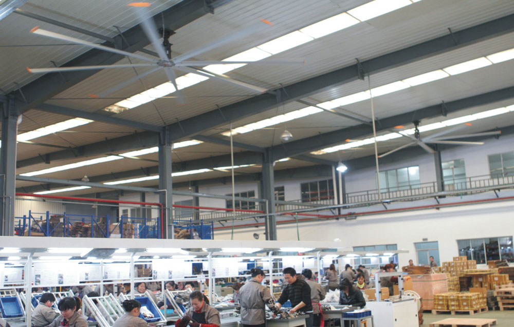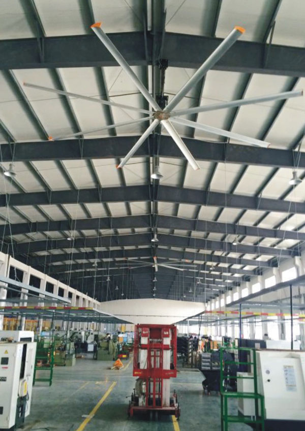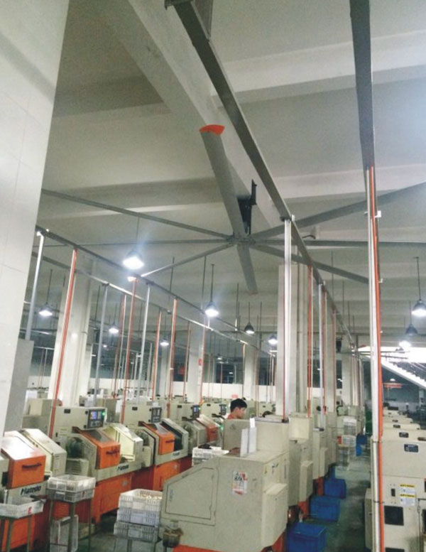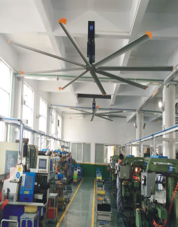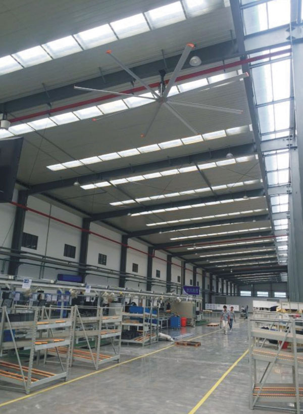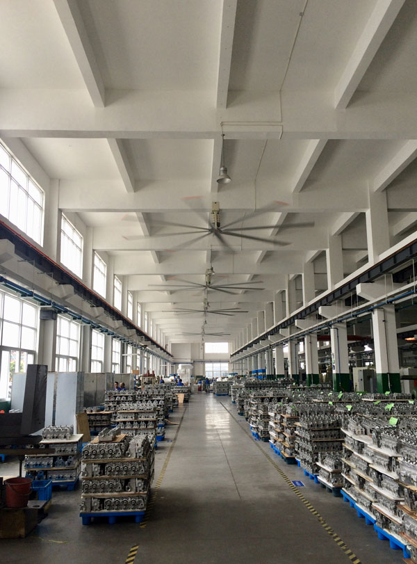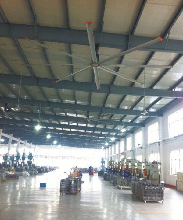 我公司生產(chǎn)的大型工業(yè)吊扇直接懸掛在廠房屋梁下,風力柔和,能加快車間空氣流通,有效降低車間內溫度,改善車間空氣環(huán)境質量,有利于員工的身體健康。