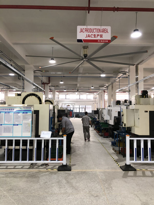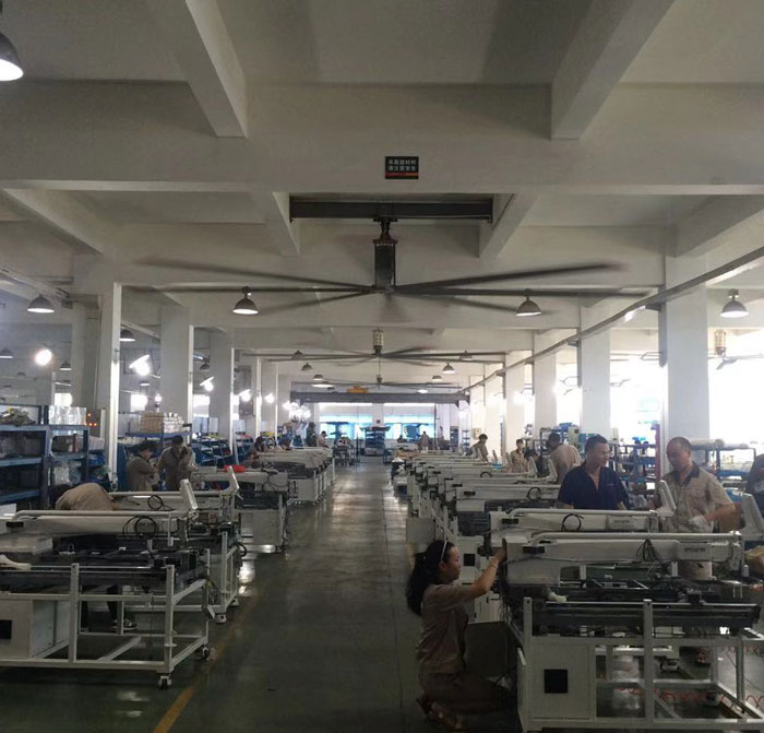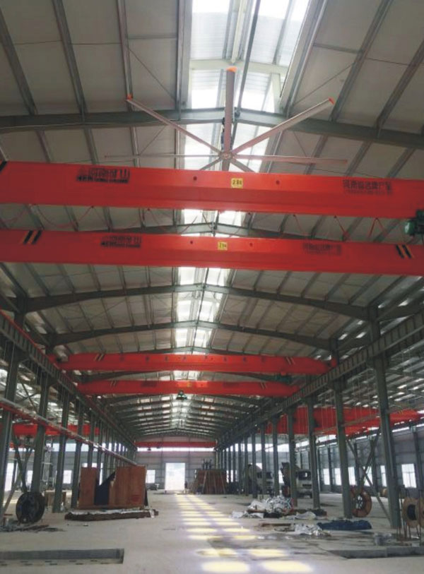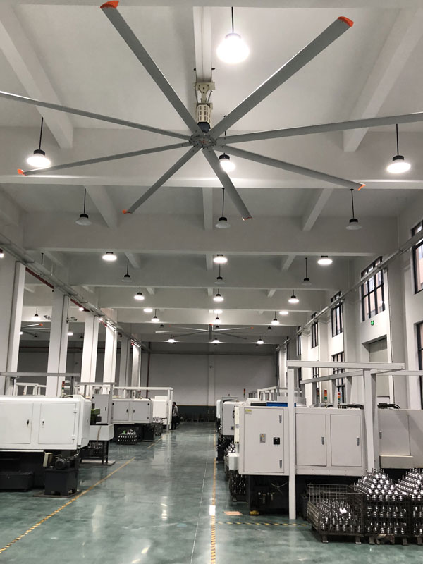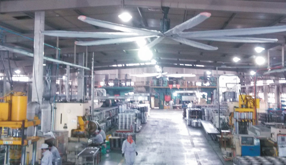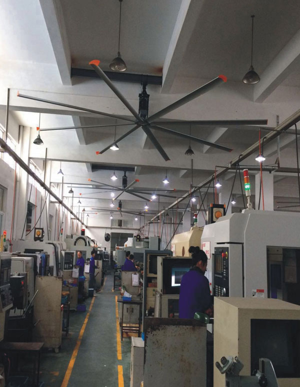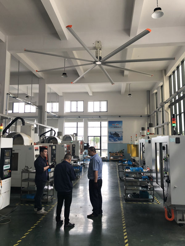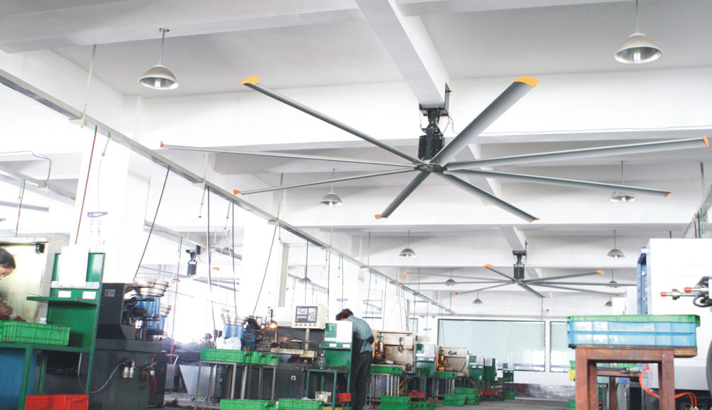 我公司生產(chǎn)的大型工業(yè)吊扇直接懸掛在廠房屋梁下,風力柔和,能加快車間空氣流通,有效降低車間內溫度,改善車間空氣環(huán)境質量,有利于員工的身體健康。